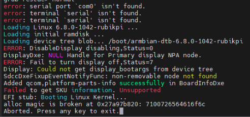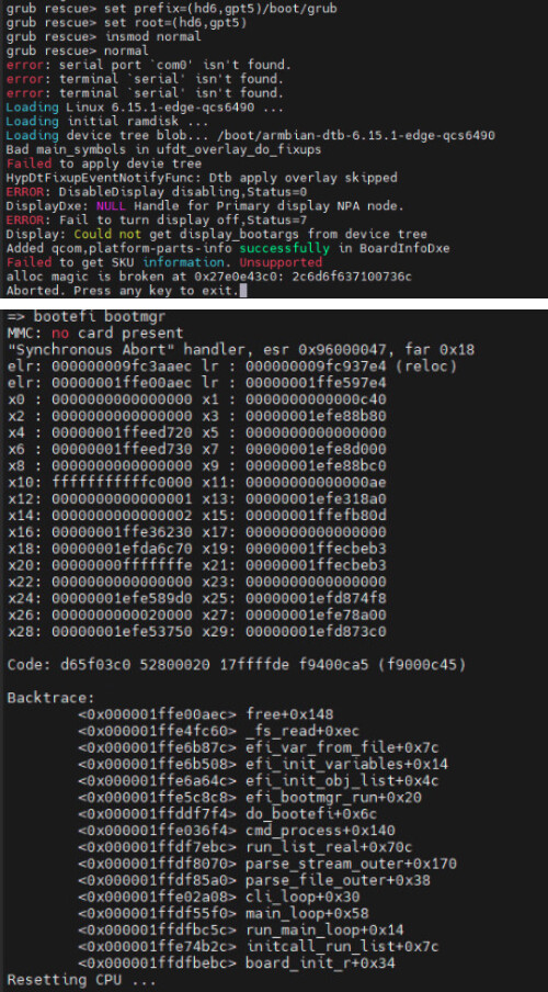 linaro提供了一种使用uboot去替换uefi分区里面的edk2来实现efi启动的方式,但是目前根据他们的源码编译后无法进入uboot,使用预编译的uboot会崩溃,如图二所示