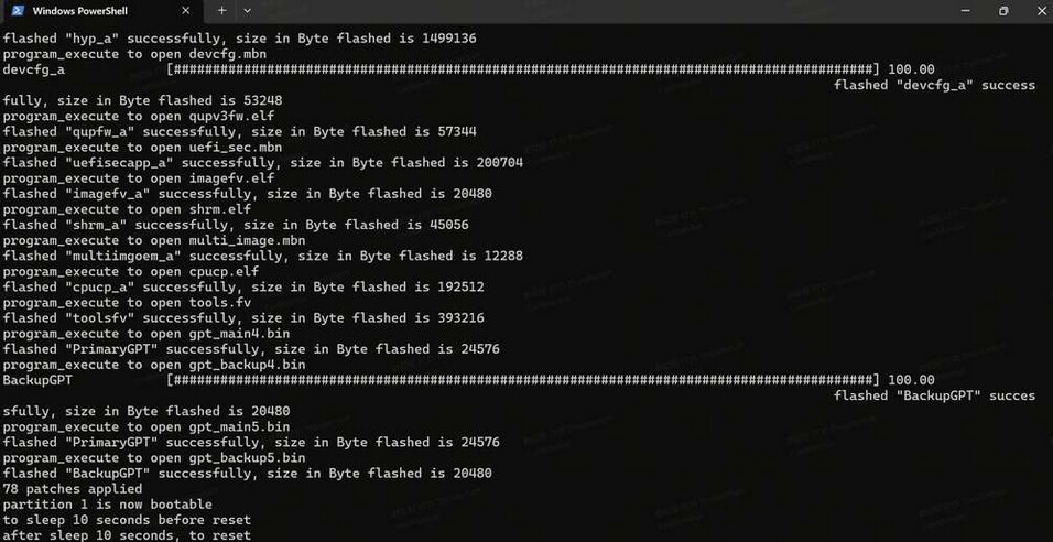 flashed “xbl_config_a” successfully, size in Byte flashed is 327680