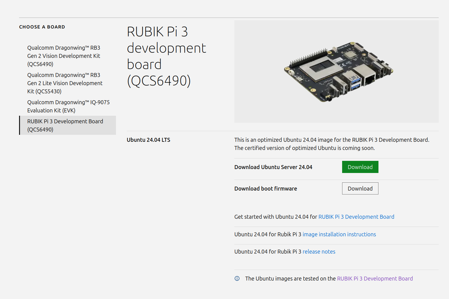 Ubuntu 24.04 Sever 版本镜像发布,点击访问 Canonical 官方网站 ,点击 RUBIK Pi 3 Development Board(QCS6490) 下载相关镜像;