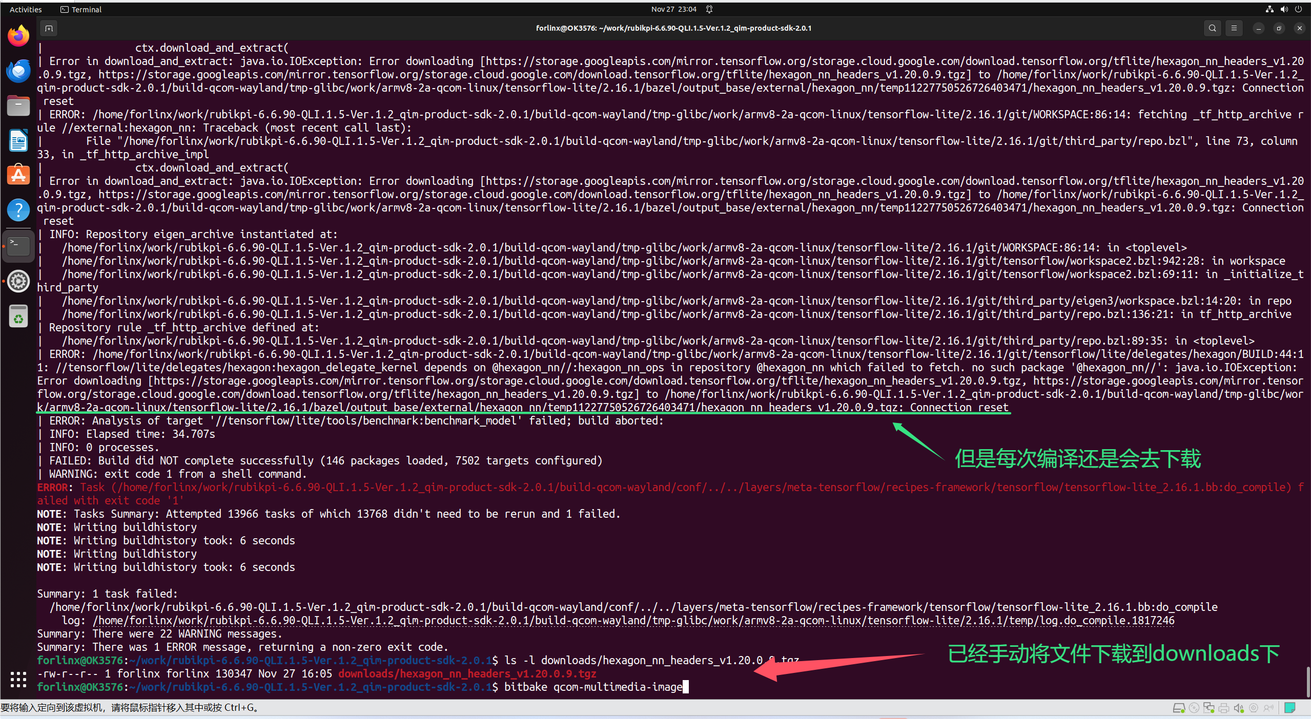 目前编译qcom-minimal-image、qcom-console-image都成功了,但是编译bitbake qcom-multimedia-image时候卡在了tensorflow的编译。尝试将下载失败的文件手动下载并放到downloads文件夹下,但是编译的时候还是去下载。