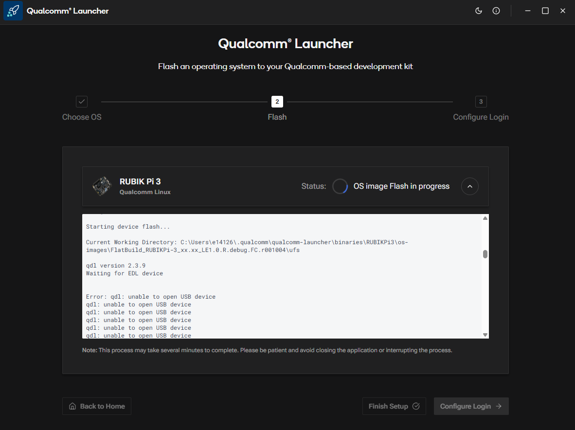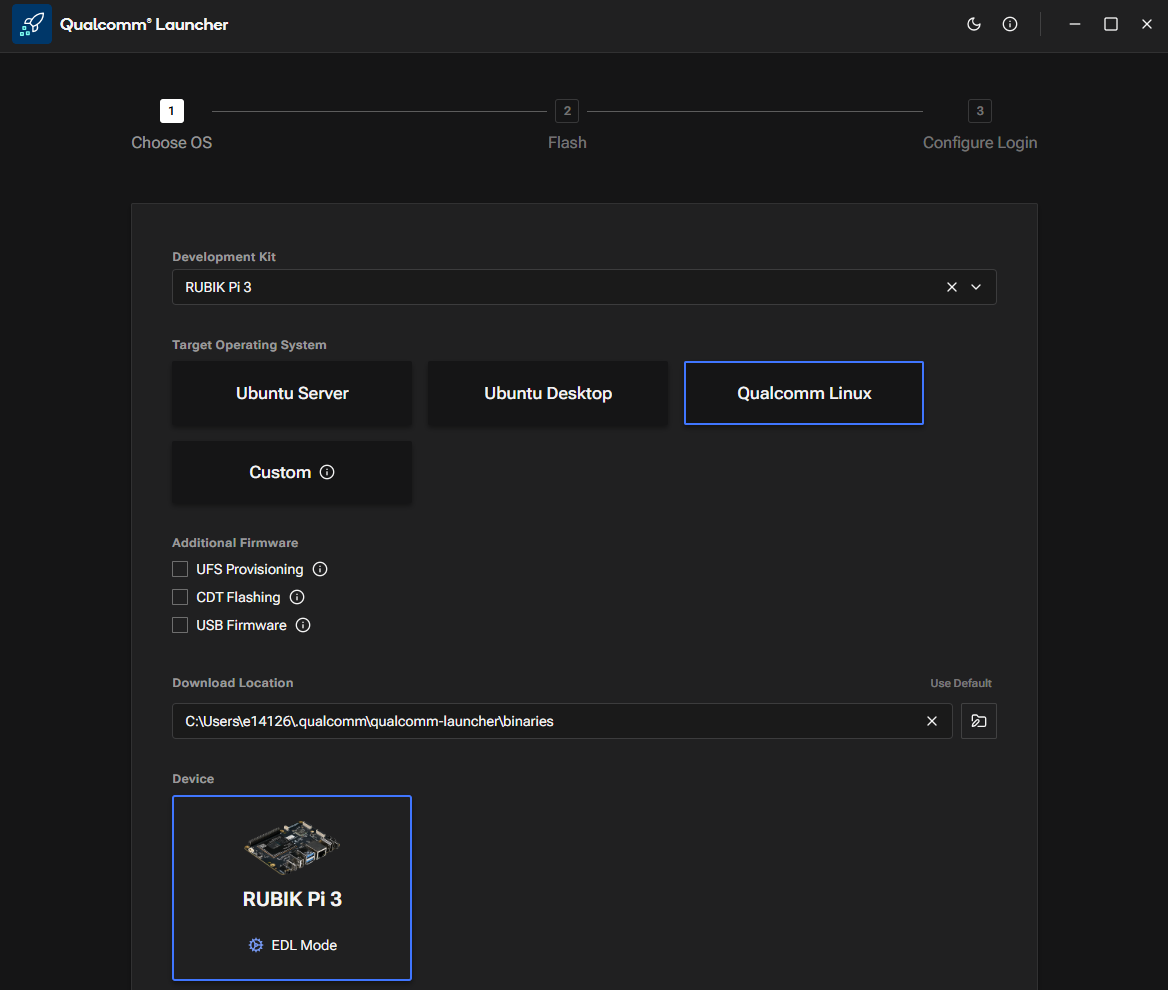 Current Working Directory: C:\Users\e14126\.qualcomm\qualcomm-launcher\binaries\RUBIKPi3\os-images\FlatBuild_RUBIKPi-3_xx.xx_LE1.0.R.debug.FC.r001004\ufs